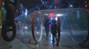 | And so we come to the challenges. Before The Mixer, before the concept of "frenemies" (friends-and-enemies at the same time, do you see?), there's an opening challenge, the same every time. Tube Strike has the pairs of friends cooped up in giant plastic lozenges, running across the studio floor. The task is two-fold: first upend the lozenge so that it strikes a ball in the opposite corner, then return to the middle and burst a balloon. The first pair to burst the balloon wins the Hand of Friendship, which they can use in the final – if they get there.