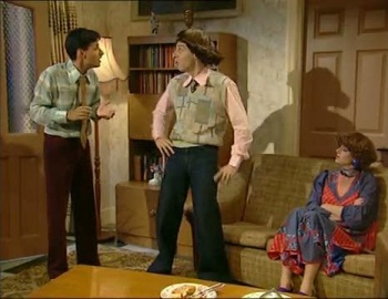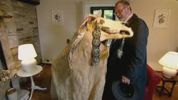 And so it was in the episode we saw. Harold and Ethel brought along their singing pantomime horse Dobbin, and their jester Claypole helped stage a pantomime for the youngsters of the village. Quondam squatters Frank and Valerie were shown enjoying hot running water and central heating, little luxuries that most of the viewers will take for granted; they entertained the villagers with some artwork and a little improvised theatre.