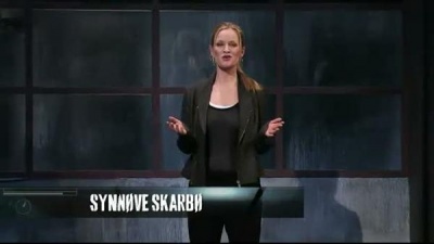 Our host for proceedings is Synnøve Skarbø; dressed in dark clothes, she's a friendly presenter, but isn't going to stand any nonsense. She will show us some slightly spoiler-iffic footage of what's going to come up, but only from the first half of the programme.