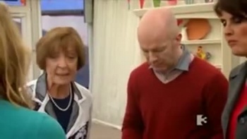 Again, the cooking ends, and the judging begins. Again, we have exceedingly focussed shots of the cakes. Again, we have the judges giving their points, and Biddy declaring cakes to be "moist" – or, in one case, "soggy". This time, the judges are offering opinions on twelve very similar cakes, and the whole thing gets more than a little repetitive.