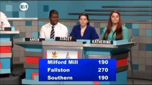 They briefly meet the teams, and spend a bit longer introducing the scorekeepers – also the team's mentors. Art stands by a board containing 20 numbered envelopes, and one is chosen for the first side. The envelope contains ten academic questions, and Art will try to get through all those questions in a minute. That'll take some doing, the trio will need to interrupt most questions to hear them all. Ten points for a correct answer, and a 50 point bonus for getting all ten questions right. This is almost impossible.