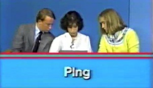 By 1989, the opening buzzer round was back, and point inflation had taken hold. For no reason, each team was spotted 100 points. We guess that that was to allow point deductions without going into negative scores. The rest of the quiz was unchanged, and we begin to see the little traditions of the show. Like the way Mac McGarry shouts the questions and doesn't stop when he hears a team's buzzer, so he asks them to repeat the answer.
