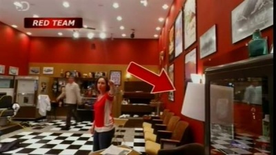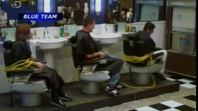 For British viewers, the first episode was set in a barber's shop. The players – all strangers – were handcuffed and restrained to three barber's chairs by tying electric flex around their bodies. The idea is that the players spin in sequence, so that the cord gets transferred from one end to the other, freeing the first player to unlock them all.