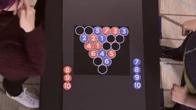 Black Hole was the Elimination match, a test of logic. On a triangle grid of length six, there are 21 spots. Each player has counters numbered 1 to 10, and place them in that order. After they've all placed their counters, there will be one space left: the black hole of the title.
