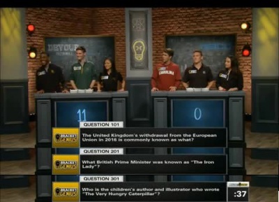 The points-winning answers from Bracket Genius: Brexit, perpetual quiz answer Mrs. Margaret Thatcher, and Eric Carle.