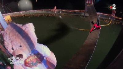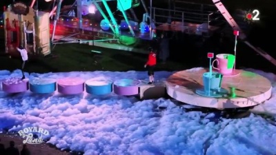 Each team throws one Boyard into the pool to summon the fairy Roni. She poses more duels, played over water. It provides a soft landing for the human cannonball.