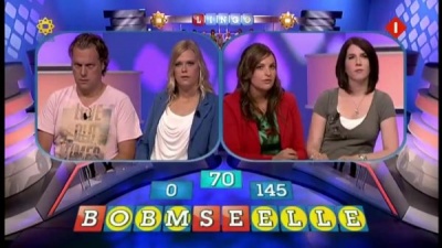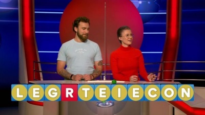 And (gosh!) a new round! The "tien letter word" round is, as the name suggests, giving clues to a ten letter word. It's shown as an anagram, and a disembodied voice gives a clue to what the word is. As time ticks on, more letters are slotted into position, and the number of points available falls. One buzz per team, and a right answer earns €10 for each letter out of position. After this, a chat with the players – it's no longer a tune-out point at the start.
