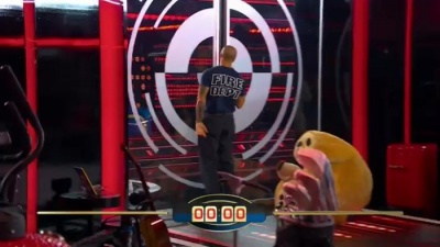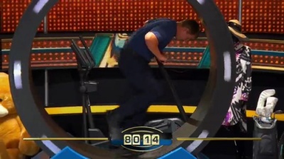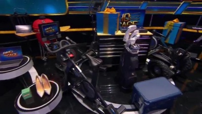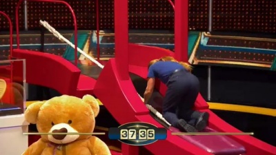 The grand finale is a bonus round, played only by the team who have emerged on top from the main game. (Their vanquished opponents leave with nothing.) No questions, a full 90 seconds in the cage, the players go in one at a time and tag each other out. Yes, players can go back in, but only when tagged. Three stunts hide prizes, one of them is a brand new car.
