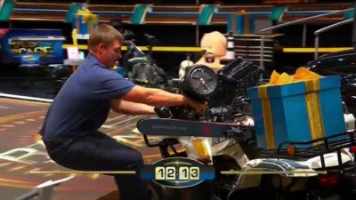 Rounds two and three continue in a similar style. The questions get a little tougher, and the time for a correct answer goes up – 5 seconds in round two, 7 seconds in round three. The prizes get somewhat more valuable. And there are bizarre stunts to do, haul yourself up a slide while kneeling on a skateboard to win a motorbike. Players put items in their pockets, and perhaps try to stuff things down their tops.