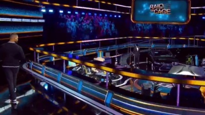 The set is suitably huge. It has to be: they've got a whole "cage" down there full of prizes. The cage is on the studio floor: one of our hosts stands on a large platform to one side of the studio, and it's here where the contestants gather. A crowd sits in raked seats looking down on the action. Buried in the credits is the fact that Raid the Cage is recorded in Mexico City, where a local version's been in production for some years. The format was created by Shy Barneli, Tal Berman, and their United Studios of Israel Ltd company.