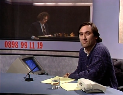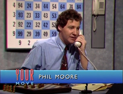 Claimed as the first ever interactive game show, this was a "computerised phone-in" in which the entire nation played a game of chess against grandmaster Jon Speelman. Viewers could vote for the next move by phoning a number whose last four digits represented the move's start and finish squares (similar to the common "e2-e4" notation, but using numbers instead of letters). Some of the callers also got to discuss their choice of move on air, and when the game was over, Speelman selected the best move made against him, and one of the viewers who voted for that move won a chess computer.